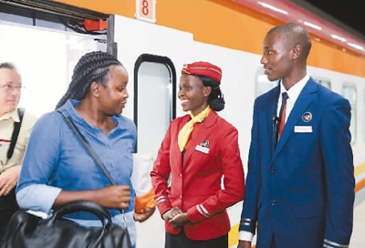 蒙內(nèi)鐵路是中國(guó)幫助肯尼亞修建的一條全線采用中國(guó)標(biāo)準(zhǔn)的標(biāo)軌鐵路,全長(zhǎng)480公里,東起港口城市蒙巴薩,西至內(nèi)羅畢,未來(lái)還將延伸至烏干達(dá)、盧旺達(dá)等非洲國(guó)家。這條鐵路是肯尼亞獨(dú)立以來(lái)的最大基礎(chǔ)設(shè)施建設(shè)項(xiàng)目,也是肯尼亞實(shí)現(xiàn)2030年國(guó)家發(fā)展愿景的“旗艦工程”,將于5月31日正式通車。圖為5月29日,在肯尼亞蒙內(nèi)鐵路蒙巴薩西站,兩名列車員站在車廂門口指引試乘旅客下車。