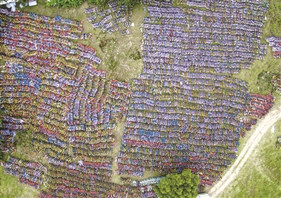 昨日,記者在城南秋濤路某加油站附近一處空地上,拍攝到上萬輛共享單車密密麻麻停在一起。據(jù)了解,這些都是被暫扣的共享單車。這張圖只是其中的一部分。