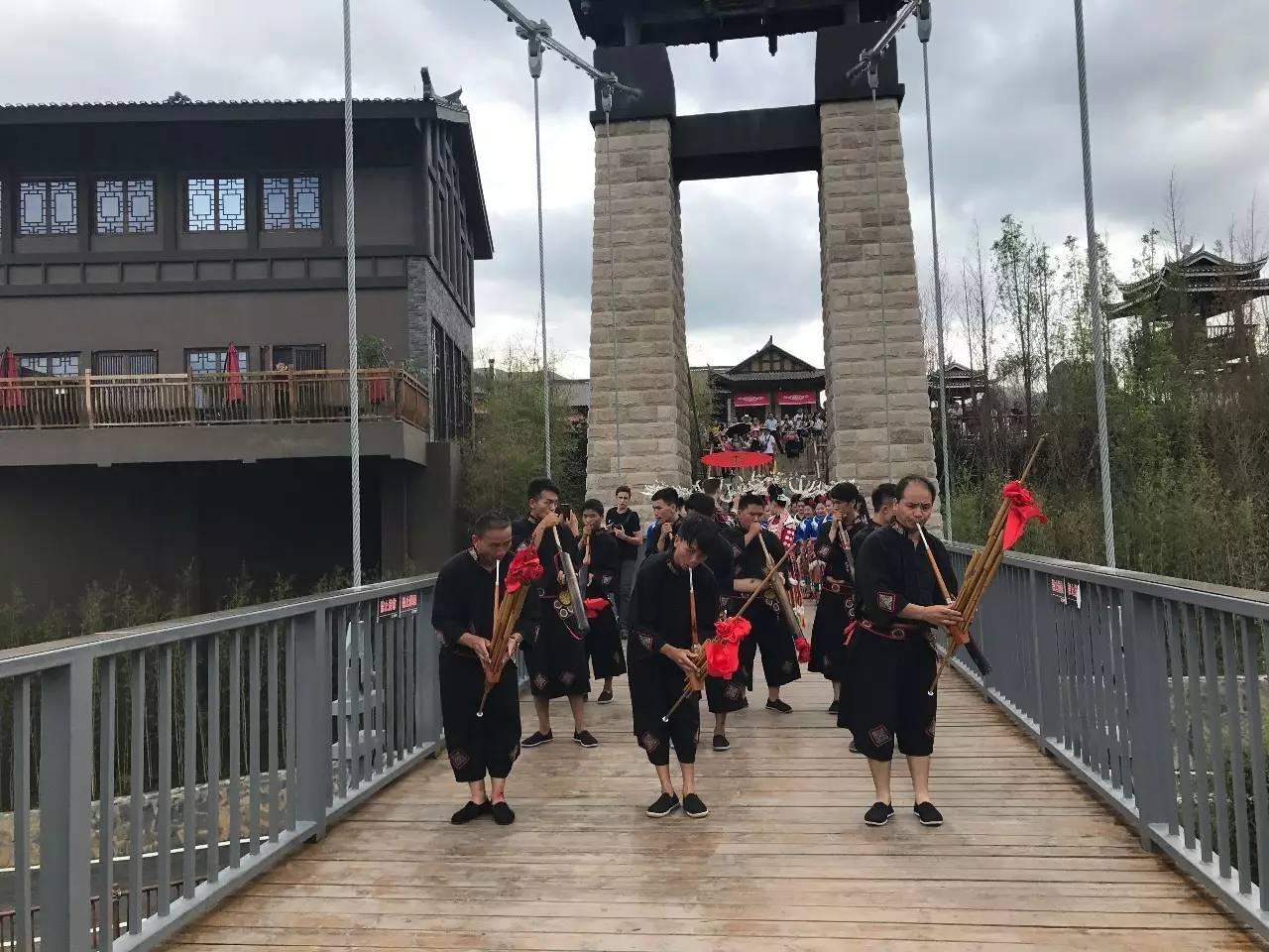 “新郎新娘”行經(jīng)小鎮(zhèn)吊橋上