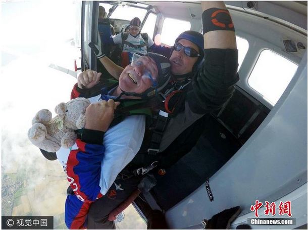 近日,來自英國的老人Geoff Dean為了給研究治療帕金森癥籌款,同時慶祝自己74歲生日,他帶著一家人,祖孫三代,一起從高空跳下,完成了一次驚險的跳傘。圖片來源:視覺中國