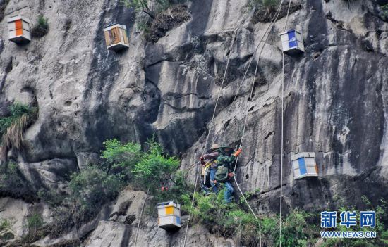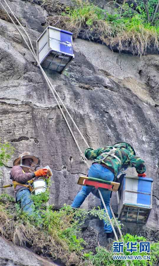 5月20日,在北京密云區(qū)馮家峪鎮(zhèn)西口外村,養(yǎng)殖戶在山崖上采集崖蜜。新華社記者 李欣 攝