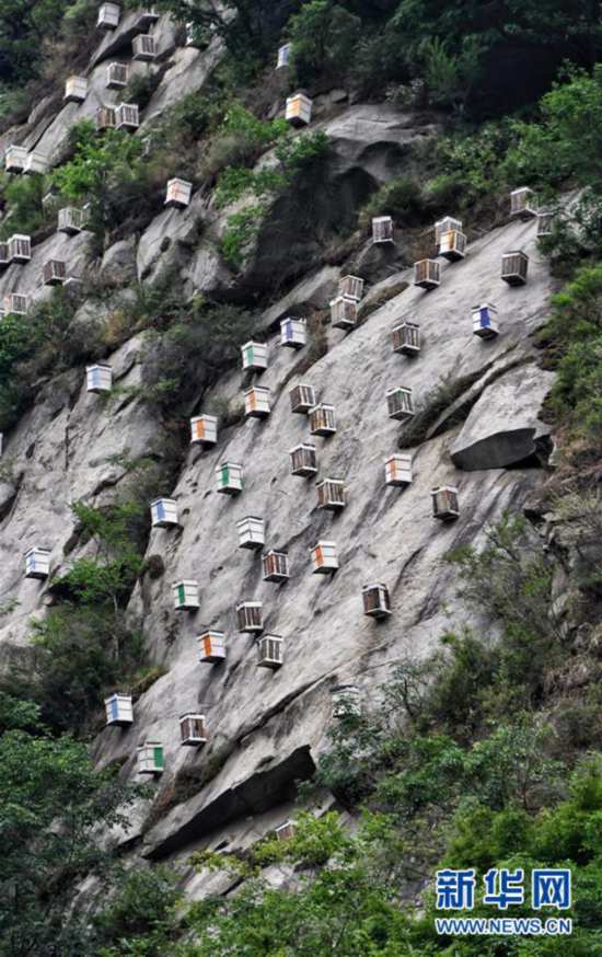 這是5月20日拍攝的北京密云區(qū)馮家峪鎮(zhèn)西口外村山崖上懸掛的蜂箱。新華社記者 李欣 攝