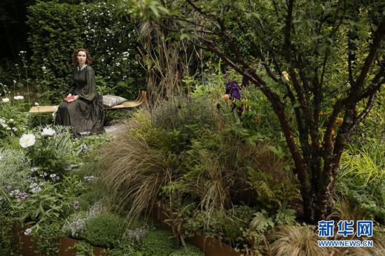 5月21日,在英國倫敦,一名模特坐在切爾西花展的一個花園里。新華社發(fā)(蒂姆·愛爾蘭 攝)