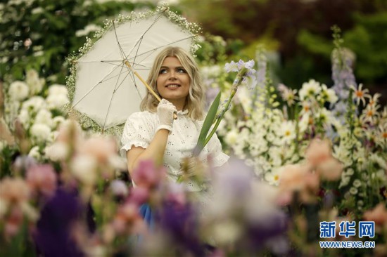 這是5月21日在英國倫敦切爾西花展上拍攝的一名模特。新華社發(fā)(蒂姆·愛爾蘭 攝)