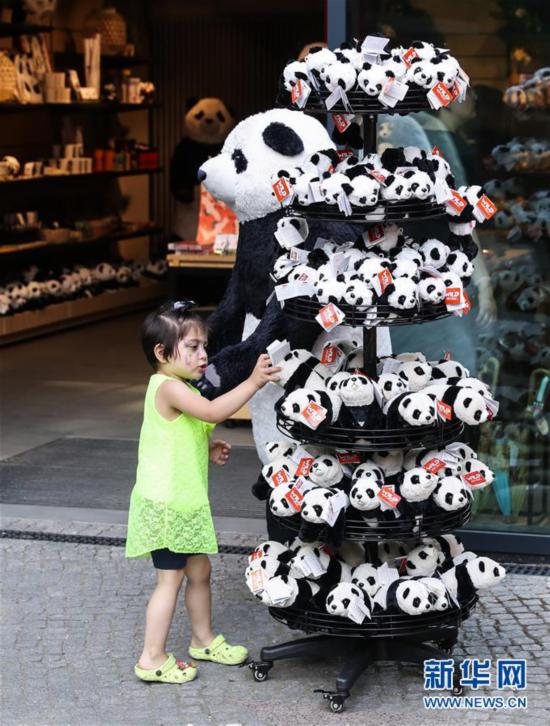 6月9日,在德國柏林動物園,一名女孩挑選大熊貓玩偶。來自中國的大熊貓“夢夢”和“嬌慶”于2017年6月24日抵達(dá)德國柏林。在過去近一年的時間里,當(dāng)?shù)孛癖妼λ鼈兊臒崆槲从薪z毫減退。它們?nèi)缃褚殉蔀榘亓謩游飯@的“明星”。新華社記者 單宇琦 攝