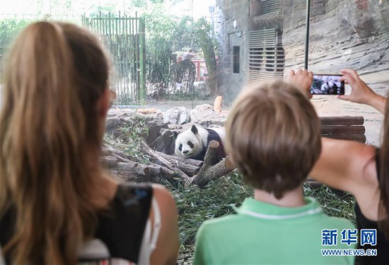 6月9日,在德國柏林動物園,游客觀看大熊貓“嬌慶”。來自中國的大熊貓“夢夢”和“嬌慶”于2017年6月24日抵達(dá)德國柏林。在過去近一年的時間里,當(dāng)?shù)孛癖妼λ鼈兊臒崆槲从薪z毫減退。它們?nèi)缃褚殉蔀榘亓謩游飯@的“明星”。新華社記者 單宇琦 攝