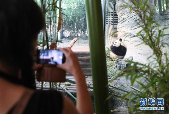 6月9日,在德國柏林動物園,一名游客為大熊貓“嬌慶”拍照。來自中國的大熊貓“夢夢”和“嬌慶”于2017年6月24日抵達(dá)德國柏林。在過去近一年的時間里,當(dāng)?shù)孛癖妼λ鼈兊臒崆槲从薪z毫減退。它們?nèi)缃褚殉蔀榘亓謩游飯@的“明星”。新華社記者 單宇琦 攝