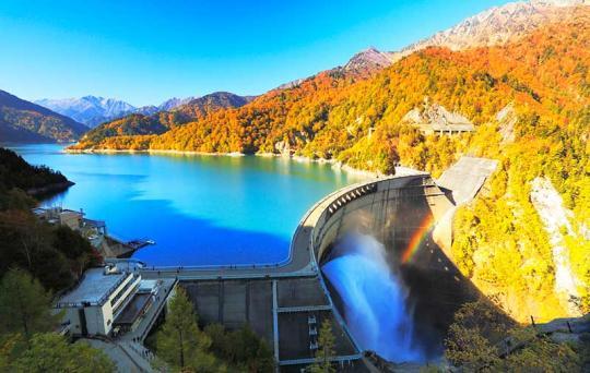 黑部水壩為日本最高大壩,高達(dá)186米,放水時大水從壩面噴奪而出,氣勢磅礴,引人注目,是一處坐落在雄偉的北阿爾卑斯山脈中的世界不多見的的大型水壩。