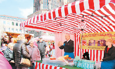 循著人聲深入鬧市區(qū),一個傳統(tǒng)市場令人眼前一亮:紅白條紋相間的帳篷搭構(gòu)成一個個小攤位,琳瑯滿目的商品吸引人們駐足觀賞。姑父向我介紹,紐倫堡的圣誕市場是德國歷史最悠久、規(guī)模最大的傳統(tǒng)圣誕市場。往往從11月底持續(xù)到圣誕,各類圣誕裝飾、酒水小食可在這里一站式購齊。