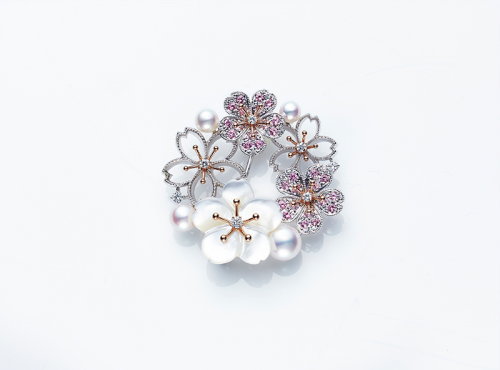 這是阪急百貨店5樓MIKIMOTO的胸針。惹人憐愛的櫻花色別出心裁的搭配上白蝶貝、鉆石、白金以及Akoya珍珠,平添華麗纖細(xì)感的精巧設(shè)計感。
