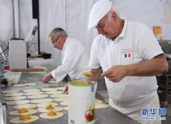 5月11日,在法國巴黎圣母院附近舉行的第24屆面包節(jié)上,面包師制作蘋果面包。新華社記者高靜攝
