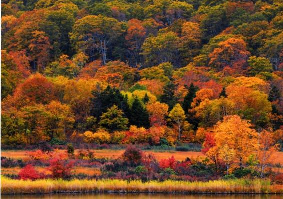 “八幡平”位于“秋田”和“巖手”兩縣的交界,9月下旬就可以欣賞到紅葉了,欣賞期可延續(xù)到11月上旬。在“八幡平”能透過車窗看到“盾形火山線”和“樹海線”上層林盡染的紅葉。除此之外,還能在寧靜祥和的“大沼”,以及在能探尋到火山現(xiàn)象的“后生掛”等步行道上,邊走邊探尋紅葉名勝。這里的紅葉種類有樺樹、花楸、山毛櫸、楓樹、白樺。推薦的觀景點(diǎn)是八幡平山頂觀景臺(tái)、大深澤觀景臺(tái)、蒸之湯觀景臺(tái)、大沼自然研究路、湯瀨溪谷散步道。