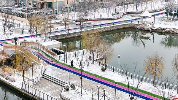 市民在山東省樂陵市玉心湖公園迎雪晨練