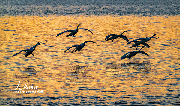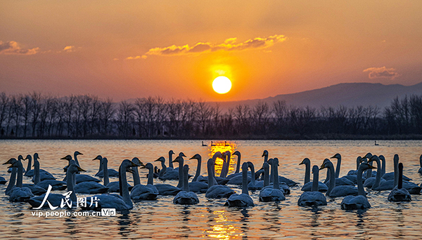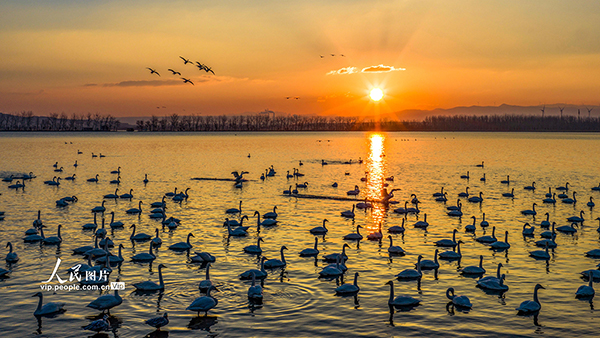 2026年1月6日,山西運(yùn)城芮城縣圣天湖景區(qū),霞光映照,湖面粼粼,成群的白天鵝在晨光中游弋,與山水相映,宛如一幅靈動(dòng)的生態(tài)畫卷。薛俊攝(人民圖片網(wǎng))