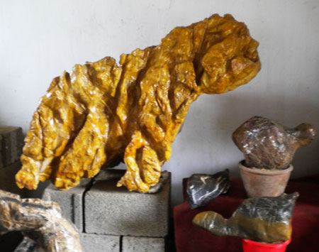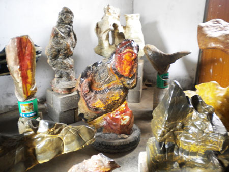 記者拍照后,車繼續(xù)前行看到沿途村民街巷之間,幾乎家家門前都寫有奇石出售的字樣,門旁、路邊各類型狀的石頭都堆放著。10點30分,車馳入?yún)瘟毫謭,場長段寶松熱情接待,大致介紹了村民們依靠挖掘奇石增加經(jīng)濟收入的小故事。在奇石市場33號,奇石銷售者石永強介紹了來自全國的客戶,絡繹不絕的選購奇石。