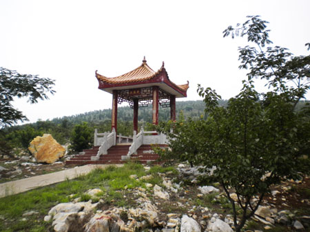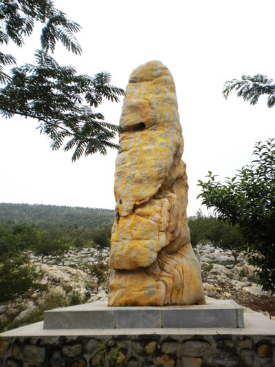 中國黃淮網(wǎng)訊(采編部主任 滕富強 / 特約通訊員 陸靜、倪鳳堂) 2011年8月23日(處暑),經(jīng)幾場秋雨的洗禮,酷暑已消去幾分,涼爽宜人。人民日報社市場報網(wǎng)絡版中國黃淮網(wǎng)采編部主任與江蘇省徐州市銅山區(qū)伊莊鎮(zhèn)鎮(zhèn)長張邦軍相約,采訪原生態(tài)呂梁風景區(qū)。上午九時許,副鎮(zhèn)長趙玉明和鎮(zhèn)宣傳委員陸靜駕車接記者前往,經(jīng)1小時的奔馳,在陸委員的指引下汽車馳進聞名全國的奇石谷。那是一條蜿蜒十里的山路,只能容得一輛汽車前行,幾年前還是陸委員以有限的資金,調動各種資源,劈石填溝,為鄉(xiāng)親們開出一條致富路。兩面青山植被,一片郁郁蔥蔥,其間便有滿坡亂石如群羊伏臥,好一派雨后青山綠蓉蓉、梁山頂上出彩虹的景象。車至五里亭,車駐人下,陸委員娓娓道來當年在此山中她發(fā)現(xiàn)并挖出奇石的情況。記者發(fā)現(xiàn)集水窖旁一座6米高的呂梁石,左面看,像孔子須發(fā)飄動,挺胸而立地瀏覽群山,右面看又像大禹俯身凝神,察看川中流水,真奇石也。