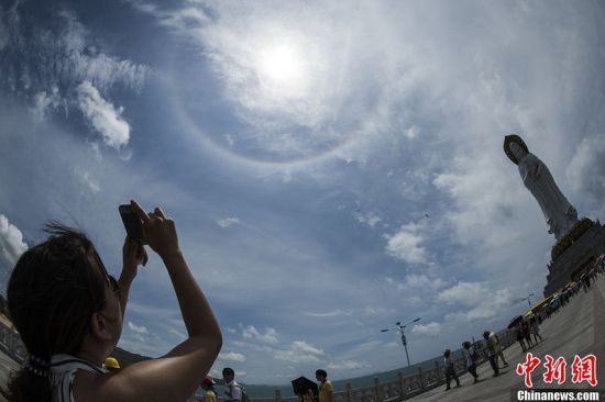 4月29日,海南三亞上空出現(xiàn)罕見的日暈奇觀,在三亞南山景區(qū)108米海上觀音像前,不少游客駐足觀看這一奇景。中新社發(fā) 駱云飛攝