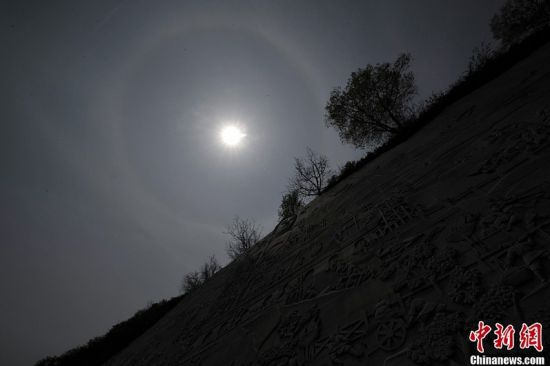 5月1日,山西太原上演日暈奇觀,日暈光環(huán)與世界最早的大型石刻佛像蒙山大佛相得益彰。韋亮 攝