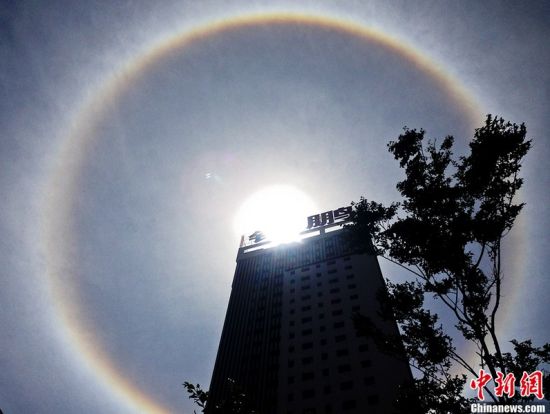6月3日上午11點(diǎn)20分,安徽省宿州市上空出現(xiàn)“日暈”奇觀,太陽四周有一個(gè)巨大的彩虹圈,引來不少市民駐足觀看。日暈是一種大氣光學(xué)現(xiàn)象,多出現(xiàn)在春夏季節(jié)。民間有“日暈三更雨,月暈午時(shí)風(fēng)”的諺語。中新社發(fā)馬勇 攝 圖片來源:CNSPHOTO