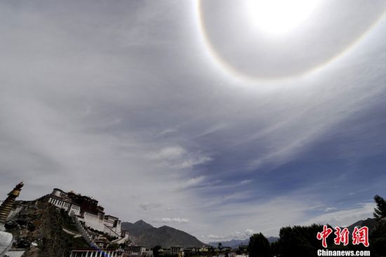 9月2日,拉薩上空出現(xiàn)日暈奇觀。日暈是一種大氣光學(xué)現(xiàn)象,是日光通過卷層云時(shí),受到冰晶的折射或反射而形成的。圖為信教群眾手中的轉(zhuǎn)經(jīng)筒與天空中出現(xiàn)的日暈相映成趣。中新社發(fā)李林 攝