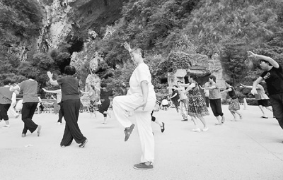“長(zhǎng)壽之鄉(xiāng)”廣西巴馬吸引了全國(guó)各地游客來(lái)此療養(yǎng)治病。圖為部分療養(yǎng)者在巴馬的“百魔洞”洞口健身。
