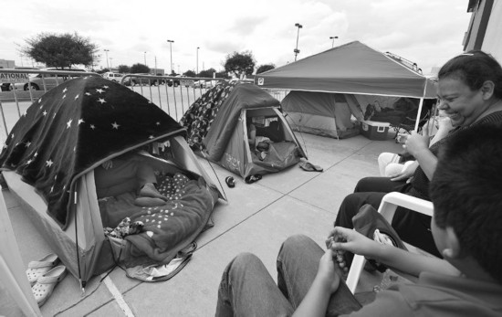 26日,美國(guó)電器連鎖賣(mài)場(chǎng)門(mén)前,一些消費(fèi)者搭起帳篷排隊(duì)等候搶購(gòu)。