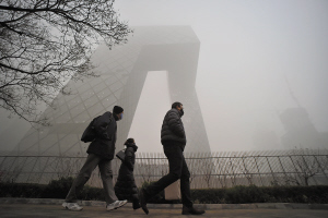 ■12月1日,幾名戴口罩的行人從中央電視臺(tái)總部大樓下走過(guò)。當(dāng)日11時(shí)50分,北京市氣象臺(tái)升級(jí)發(fā)布大霧橙色預(yù)警信號(hào),預(yù)計(jì)當(dāng)天下午到夜間,北京大部分地區(qū)將出現(xiàn)濃霧,部分地區(qū)能見(jiàn)度小于200米。11月30日,北京市氣象臺(tái)升級(jí)發(fā)布霾橙色預(yù)警信號(hào)。新華社 發(fā)