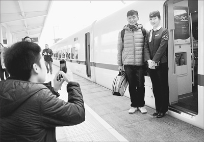 圖為旅客與乘務(wù)員在車(chē)門(mén)前合影。
