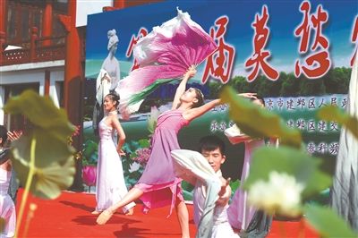南京莫愁湖公園第十二屆莫愁煙雨文化節(jié)昨在抱月樓前拉開序幕,設有荷花展、楹聯展、筆會、民俗表演等活動。 邵 丹攝