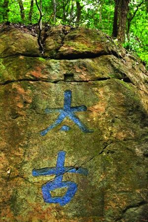 “太古”摩崖題刻,位于棲霞山試茶亭北側(cè)的一塊巨石上,與試茶亭相對。由于沒有上款和下款,此處題刻頗具神秘色彩。據(jù)棲霞山風景名勝區(qū)辦公室主任李宏介紹,“太古”二字是山上已發(fā)現(xiàn)的摩崖石刻中尺寸最大的,每字約0.5米見方。站在遠處望去,寶藍色的“太古”鑲嵌在巨大的巖石上,筆力雄厚,蒼勁有力。
