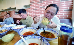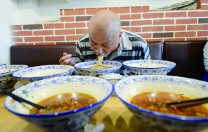 9月中旬,現(xiàn)代快報主辦的“2016南京面條大會”盛大開幕。作為“面條大會”的后續(xù)活動之一,10月21日,快報在專做陜西面的西客面館舉辦了一場“大胃王挑戰(zhàn)賽”。一碗岐山臊子面大約4兩面,“女子組冠軍”吃光了兩碗,而獲得“大胃王”稱號的48歲徐師傅,一口氣吃完了5碗面,獲得店家提供的500元“土豪面券”。