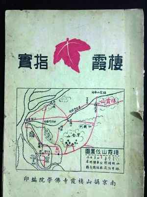 民國時期,棲霞寺佛學(xué)院就曾經(jīng)編撰過一本《棲霞指實》。封面上有紅葉圖案,中間位置是一幅棲霞山的地理位置圖。圖上清晰地標(biāo)注了棲霞山、棲霞山車站、莫愁湖、鼓樓、大行宮、玄武湖、勵志社、下關(guān)車站、和平門車站、中山陵以及堯化門車站,這些地點之間用紅線連接,顯示了前往棲霞山的路線。