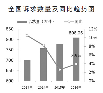 一、全國訴求總量超過800萬件,投訴量為歷史新高。2016年全國工商和市場監(jiān)管部門受理消費者訴求超800萬件,同比增長3.9%,增速較上年同期提升1.3個百分點。其中,投訴166.70萬件,同比增長29.1%,增長速度明顯高于“十二五”時期。