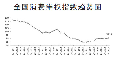 六、全國消費維權指數連續(xù)兩季度超過90,總體消費環(huán)境穩(wěn)中向好。自2015年四季度以來,全國消費維權指數值連續(xù)四個季度維持在90左右(100是中值),2016年第三季度為90.55,較上期值上漲0.99個百分點,表明全國消費環(huán)境總體呈現穩(wěn)中向好的態(tài)勢。