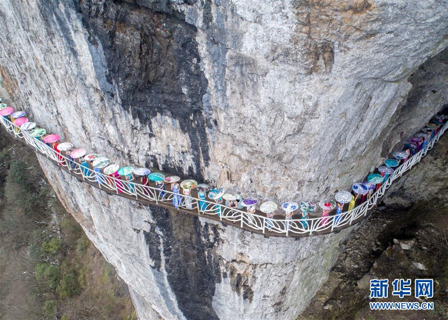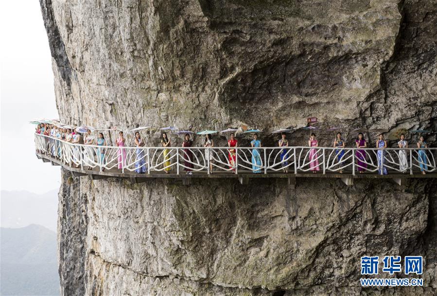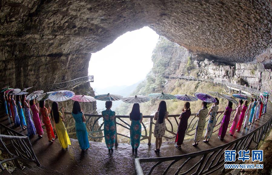 3月26日,旗袍愛好者在重慶市南川區(qū)金佛山絕壁棧道上“秀”旗袍。當(dāng)日,重慶市南川區(qū)金佛山迎來70余名旗袍愛好者,她們在3公里長、2000多米高的絕壁棧道上展風(fēng)姿,展現(xiàn)旗袍的迷人魅力。新華社發(fā)(瞿明斌 攝)