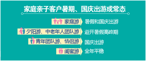 與家庭游客戶出游時間較為集中不同,時間更充裕的夕陽游、中老年團隊游客戶在出游時間上主動避開了暑假高峰期;青年團隊游客戶、夫妻游客戶更多地選擇在國慶出游;閨蜜游全年出游時間比較均衡、隨性。