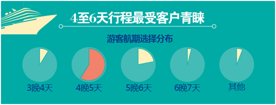 在郵輪航期方面,過去一年,59%的客戶選擇了4晚5天航期的郵輪線路,22%的客戶購買了5晚6天航期的郵輪線路。通過客戶選擇的郵輪產(chǎn)品航期結構可以看出,當前我國郵輪旅游消費仍以近海短程的日本線路為主。