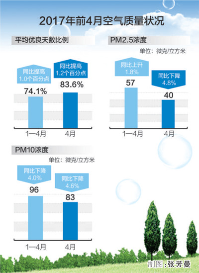 京津冀區(qū)域大氣污染防治聯(lián)合研究總體專家組介紹說,與去年同期相比,2017年3月和4月全國空氣質(zhì)量呈明顯改善趨勢,優(yōu)良天數(shù)連續(xù)兩個月同比提高,PM2.5濃度分別同比下降17.2%和4.8%。但受1—2月擴散氣象條件極端不利、PM2.5濃度同比大幅升高影響,1—4月我國部分區(qū)域和城市PM2.5平均濃度與去年同期相比仍有所上升。