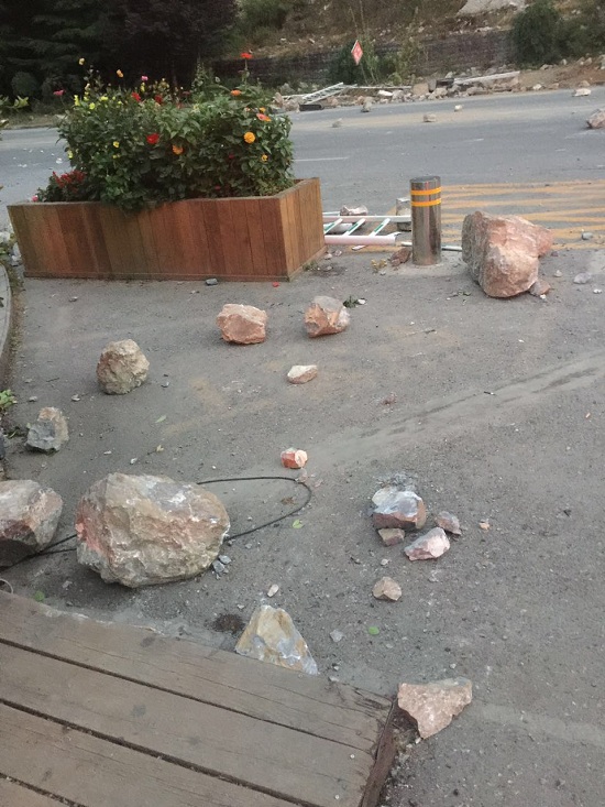 就在余震發(fā)生同時(shí),九寨溝風(fēng)景區(qū)入口處發(fā)生滑坡,伴隨著噼里啪啦的響聲,大量石塊從坡上滾下,形勢(shì)很危險(xiǎn)。記者提醒過(guò)往車(chē)輛注意安全。