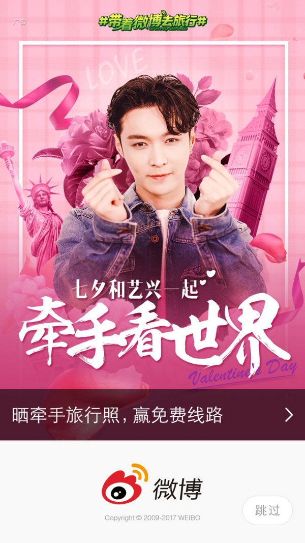 從活動(dòng)上線開(kāi)始,張藝興就通過(guò)個(gè)人微博賬號(hào)@努力努力再努力x 時(shí)常參與相關(guān)話題和微博的互動(dòng)。七夕節(jié)前夕,互動(dòng)話題#帶著藝興去霸屏#被推出,上線七夕藝興貼紙征集活動(dòng),并邀請(qǐng)網(wǎng)友制作有趣的藝興貼紙,5位粉絲制作的超人氣“藝興七夕專(zhuān)屬貼紙” 經(jīng)過(guò)粉絲票選火熱上線。網(wǎng)友帶話題詞#牽手看世界#添加張藝興專(zhuān)屬旅行貼紙,曬旅行美照、秀簽到足跡,即可接力七夕浪漫霸屏。截止七夕當(dāng)天,#帶著藝興去霸屏#話題閱讀量爆增至4700萬(wàn),討論量突破46萬(wàn)。