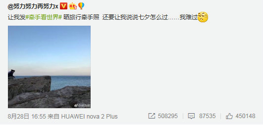 與此同時(shí),張藝興本人也通過(guò)個(gè)人微博賬號(hào)@努力努力再努力x發(fā)布七夕相關(guān)內(nèi)容,繼27日創(chuàng)意滿滿地曬出自己的“絕世名表”后,28日又“高調(diào)”發(fā)布微博內(nèi)容“讓我發(fā)#牽手看世界# 曬旅行牽手照,還要讓我說(shuō)說(shuō)七夕怎么過(guò)……我難過(guò)”,引發(fā)粉絲大膽示愛(ài)和P圖熱潮,單條“一人看海”微博便收獲了粉絲100多萬(wàn)的轉(zhuǎn)評(píng)贊互動(dòng)。