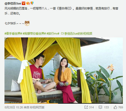 而游記視頻化的新趨勢(shì)在#帶著微博去旅行#推出獨(dú)家策劃《我想帶你看世界》旅游真人秀中盡顯無(wú)疑。旅行玩家組合@李佳訊Sue和@Roy黃元甫在巴厘島旅行中與粉絲互動(dòng),七夕當(dāng)天兩人在風(fēng)光明媚的巴厘島即興彈唱一首《情非得已》送給網(wǎng)友。