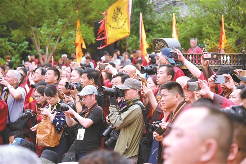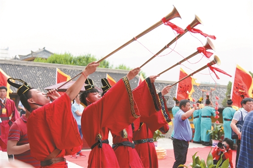 上午10點(diǎn)整,整個(gè)文化節(jié)的重要部分——漢高祖劉邦祭祀大典正式開始。沛縣漢高祖原廟內(nèi),來(lái)自臺(tái)灣、云南、北京、江蘇等國(guó)內(nèi)20多個(gè)省、市、自治區(qū)以及韓國(guó)、馬來(lái)西亞、新加坡等國(guó)家的劉氏宗親代表共千余人相聚在高祖廟前,隆重地祭拜漢高祖劉邦。伴隨著沉沉的鼓聲,長(zhǎng)長(zhǎng)的號(hào)聲,漢高祖原廟的大門緩緩打開。身穿古代服裝的樂隊(duì)奏響管樂,700多名劉氏宗親代表在旗節(jié)隊(duì)的率領(lǐng)下,從漢高祖原廟兩側(cè)入場(chǎng)。開廟、點(diǎn)香、獻(xiàn)爵、叩頭、獻(xiàn)祝帛、恭誦祭文……莊嚴(yán)的祭拜活動(dòng)有條不紊地進(jìn)行。