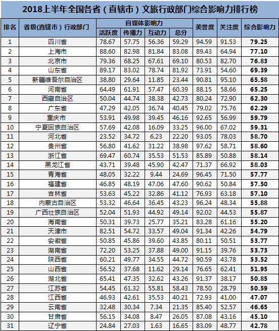 《2018上半年全國省區(qū)市文旅行政部門綜合影響力排行榜》發(fā)布