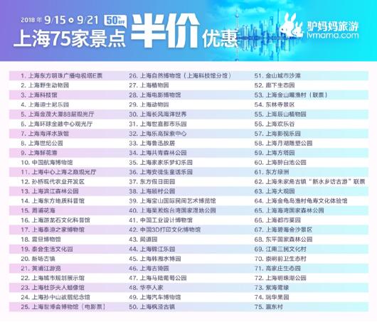 人民網(wǎng)北京8月27日電 (記者劉佳)今年9月15日至10月6日,上海旅游節(jié)將如期舉行,屆時,上海將有75家景區(qū)參與門票半價優(yōu)惠活動,半價活動將從9月15日持續(xù)到21日,為期7天。去年的旅游節(jié),共接待國內(nèi)外游客1215萬人次,游客同比增加6%。來自驢媽媽旅游網(wǎng)的數(shù)據(jù)顯示,東方明珠、上海動物園、上海歡樂谷等景區(qū)成為去年旅游節(jié)期間,最受中外游客歡迎的景點。