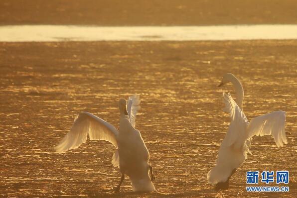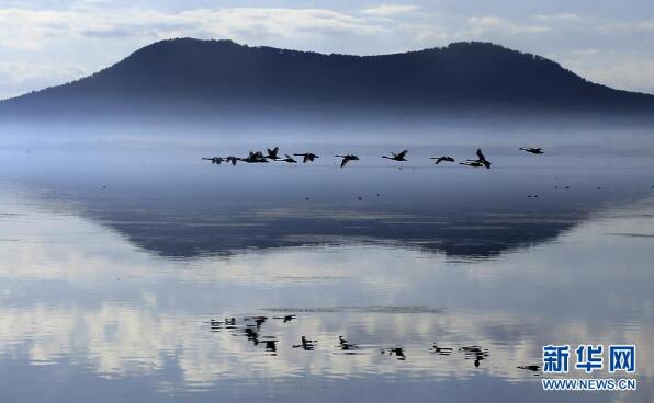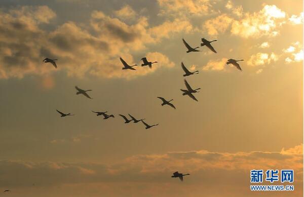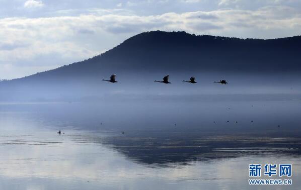 11月4日,天鵝在山東榮成天鵝湖上空飛翔。 當(dāng)日,山東榮成天鵝湖薄霧繚繞,天鵝在湖光山色中躍動(dòng),構(gòu)成一幅幅美麗的圖畫(huà)。 新華社發(fā)(王福東 攝)