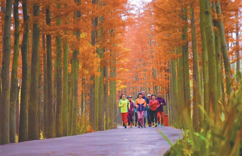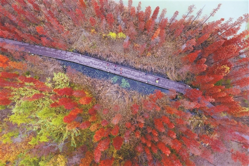 11月15日,無人機拍攝的賈汪潘安湖景區(qū)內(nèi)的池杉林。初冬時節(jié),賈汪潘安湖景區(qū)內(nèi)的池杉林色彩斑斕,與水面交相輝映,秀美如畫,吸引眾多游客前來觀賞。 徐州日報全媒體記者 孫井賢 攝 |