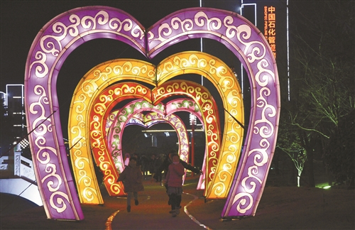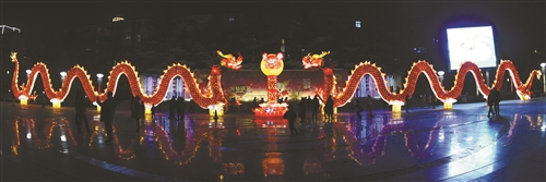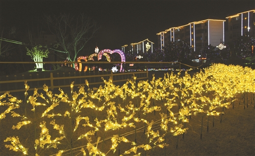 天色一晚,管道社區(qū)的上空就亮了。泉山區(qū)翟山街道管道社區(qū)千盞花燈依次亮起,“二龍戲珠(豬)”、福娃鬧春、彩虹門等花燈五彩斑斕、美輪美奐。眾多市民帶著孩子前來拍照留念、欣賞美景,陶醉在火樹銀花的海洋中。圖為2月11日晚市民觀賞花燈的場景。 徐州日報全媒體記者 陳艷 攝 |