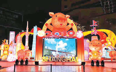 花燈中央的巨幅LED屏幕滾動播放著上海城市文化旅游形象宣傳片——《心動上!泛汀段覀兊纳虾!,展示著上海中心大廈、上海環(huán)球金融中心、金茂大廈等天際線以及外灘景色。屏幕上方和周圍分布著“喜豬”和上海旅游節(jié)吉祥物“小鹿樂樂”,它們憨態(tài)可掬,喜氣奪人,吸引了許多臺北市民駐足、拍照。