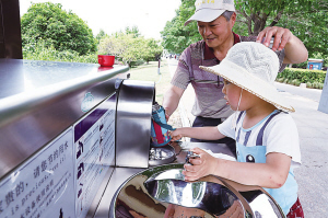 12日上午,在云龍湖景區(qū)濱湖公園東門入口處南側(cè),在煥然一新的直飲水點(diǎn)前,有市民帶著小孫子前來接水。“天熱,帶孫子出來玩,從家里帶的一杯水不夠喝的。在咱們?cè)讫埡瓮孢能喝到溫乎乎的直飲水,這水喝著放心,不用擔(dān)心小孩子喝涼水會(huì)鬧肚子了。”這位老先生邊接溫水邊點(diǎn)贊。